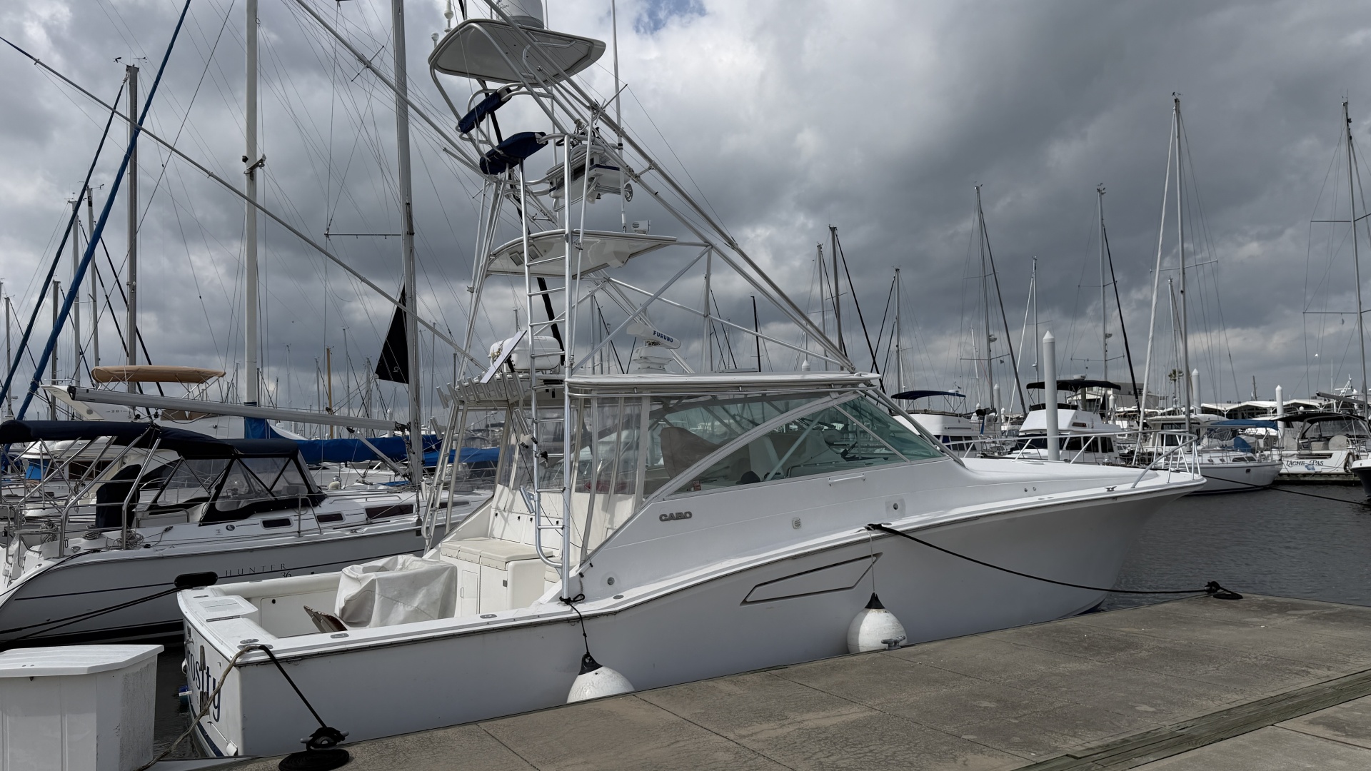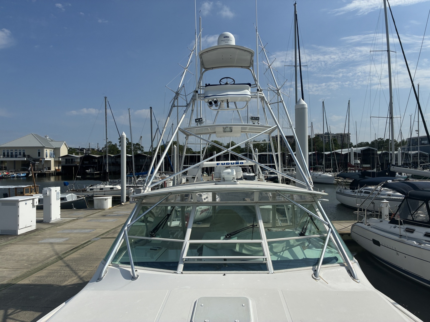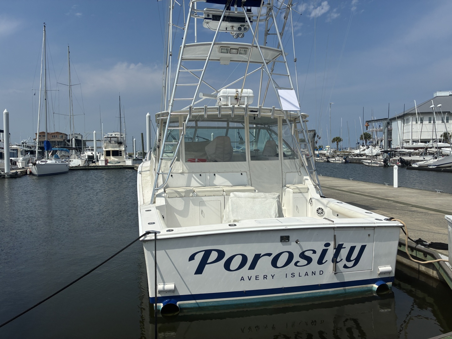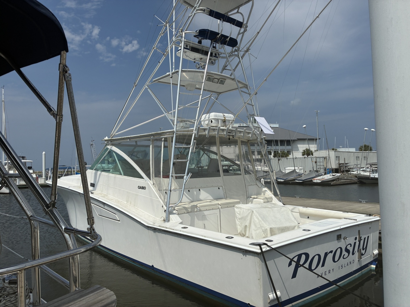 The Cabo 45 Express was one of the largest express fishermen of its day. She’s constructed on a beamy modified-V hull with cored hullsides, a deep forefoot, and a well-flared bow. Aside from her rakish profile, perhaps the most distinctive feature of the Cabo 45 is her huge bridge deck with its centerline helm, integral electronics console, and expansive lounge seating. The fully equipped cockpit comes with a transom livewell, a beautifully designed tackle center, and two huge in-deck fish boxes. The engine room, beneath the bridge deck, is massive. The standard single-stateroom interior of the Cabo 45 is meticulously finished, and the spacious salon provides seating for a small crowd. Additional features include storage for over 20 rods, an electrically controlled windshield vent, and a transom door. Cats 800hp will cruise at 28–29 knots. Over 100 were built. Porosity is the preferred two-stateroom layout and is located in the New Orleans Municipal Yacht Harbor East and only a short drive from the Louis Armstrong Airport (MSY). See the Google Map below to help plan your visit.