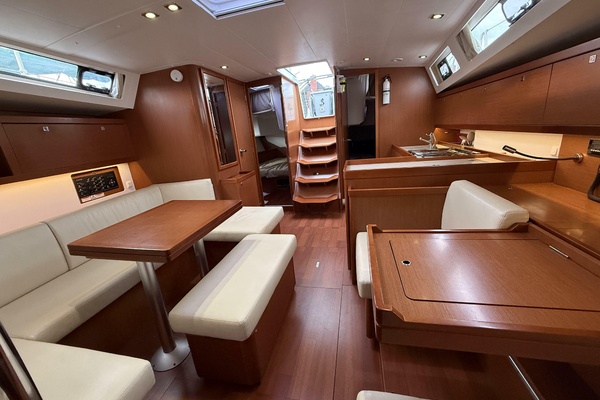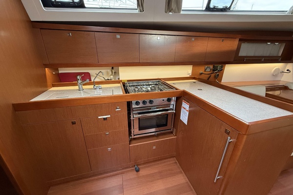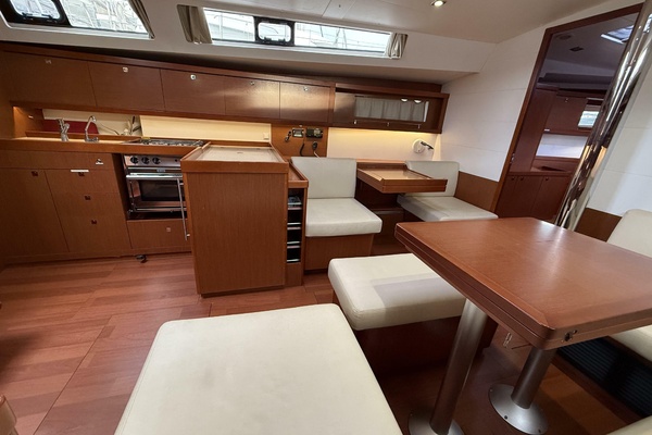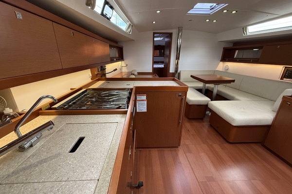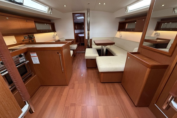 Her galley is well-appointed for extended passages, and the expansive salon is perfect for relaxed evenings at sea. Down below, plush cabins and heads create the feeling of a boutique yacht rather than a production cruiser.