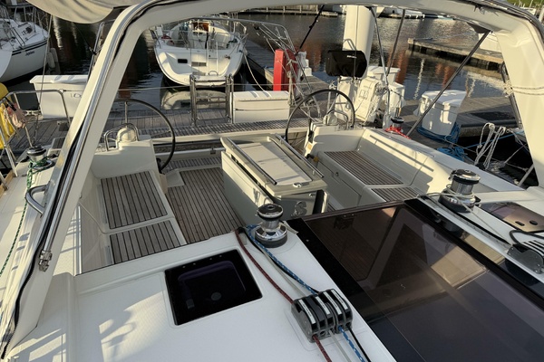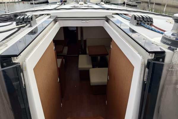Step aboard and be greeted by a spacious cockpit with dual helm stations, easy to reach lines, and an open, sociable layout perfect for entertaining or short handed sailing. The innovative 45° companionway effortlessly connects the cockpit to the salon below, creating a light-filled interior with an inviting sense of space.